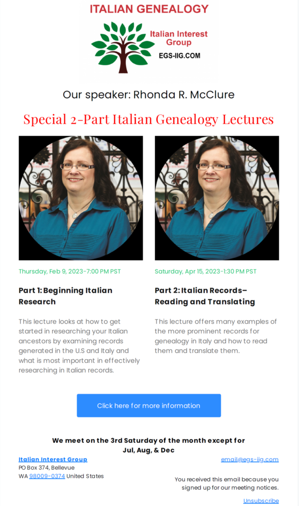 The EGS (Eastside Genealogical Society)and the Italian Interest Group (IIG) are presenting FREE 2-Part Italian Genealogy Lectures. See the attached PDF flyer which includes an active hyperlink to the Zoom meeting invitation request form.