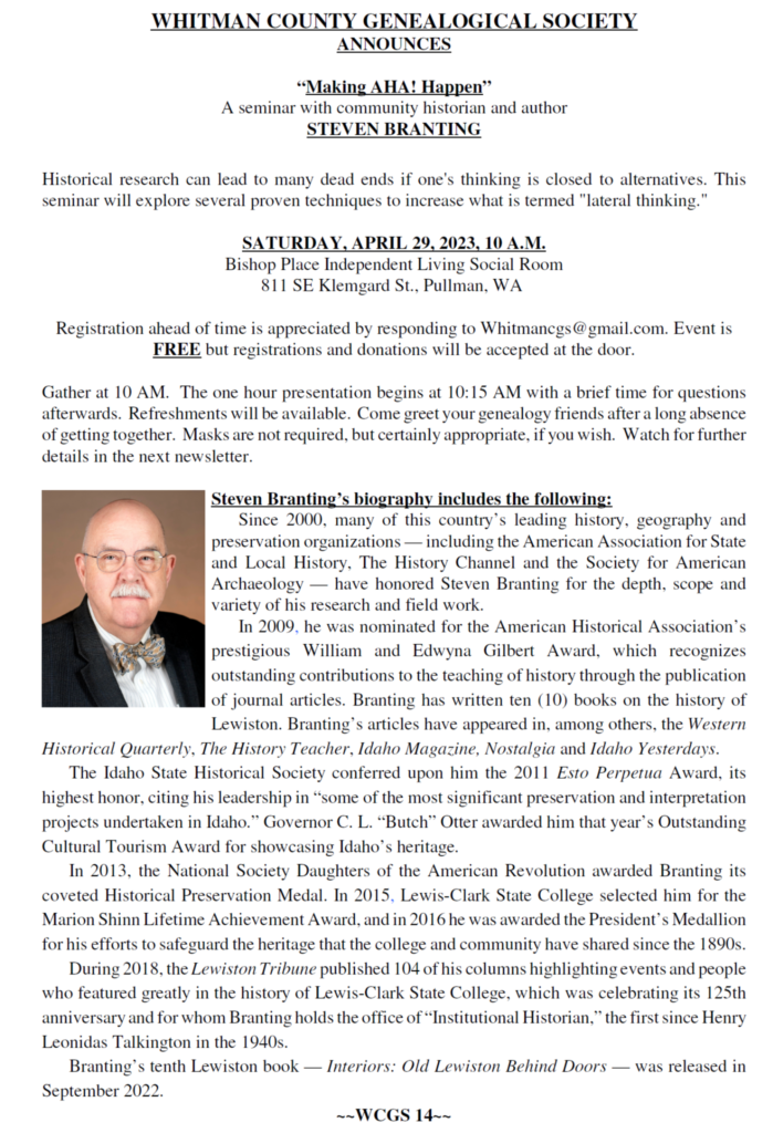 This entry was posted in 2023 Seminars & Conferences and tagged Whitman County Genealogical Society.