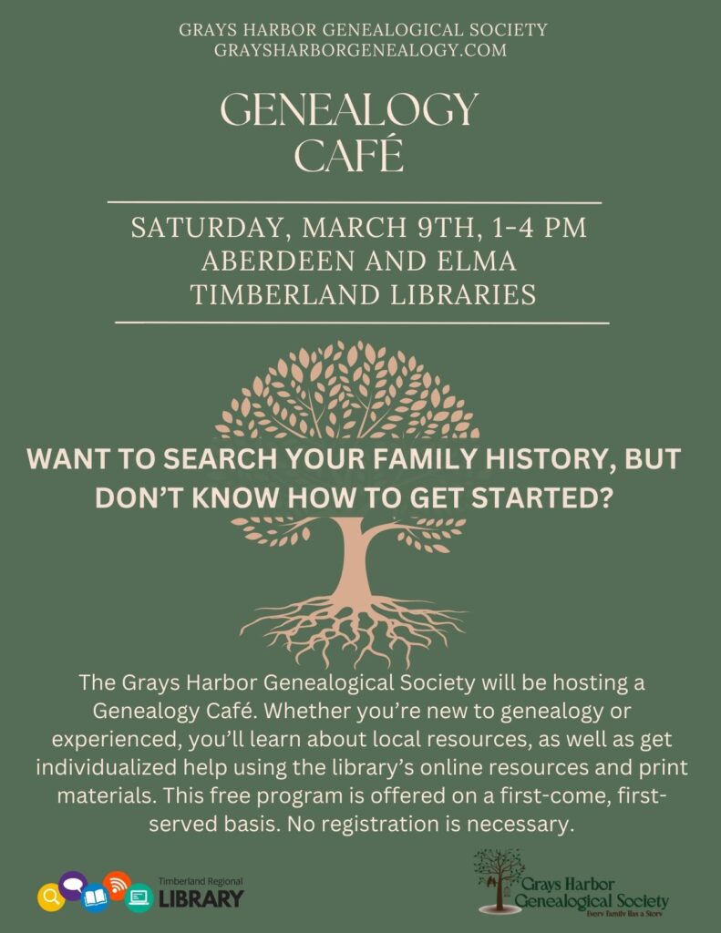 The Grays Harbor Genealogical Society will host Genealogy Cafés. Whether you’re new to genealogy or experienced, you’ll learn about local resources, as well as get individualized help using the library’s online resources and print materials. This free program is offered on a first-come, first-served basis. No registration is necessary.