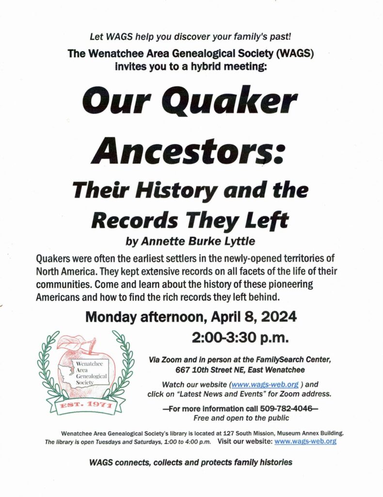Wenatchee Area Genealogical Society Our Quaker Ancestors: Their History and the Records They Left Apr2 by Charles Hansen