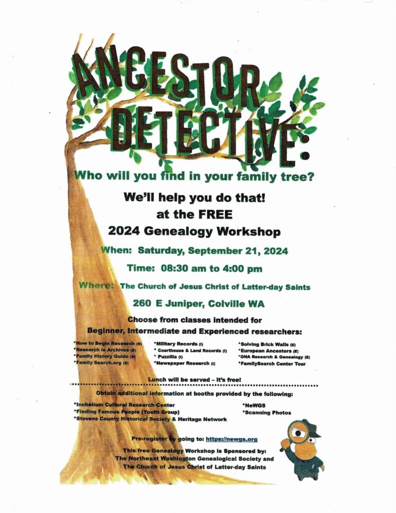 The Northeast Washington Genealogical Society in Colville is trying something new this year for their annual fall seminar.  We are partnering with our local FamilySearch Center to present a FREE all-day workshop on Saturday September 21st at the LDS church in Colville. This FREE event will include 12 different classes to choose from, informational stations and a free lunch. For more information and to register, please go to our website’s Events page at https://www.newgs.org/eventListings.php?nm=88 to download a flyer and registration form.