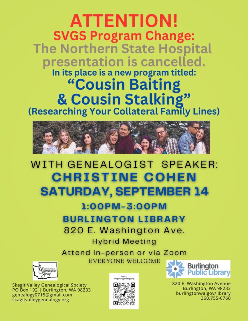 I hope you enjoyed a lovely summer break, got lots of genealogy research in during the hiatus and that you will come join us on Saturday, Sept 14 for an interesting and educational program. AND….don’t forget to come join the fun and research help offered on the Genealogy Interest Group on 2nd Tuesdays of the Month from 11am-1pm at the Burlington Public Library (we will either be in the conference room or Gentry Room. So come look for us)