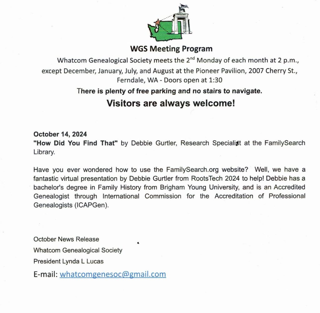 Whatcom Genealogical Society October Meeting