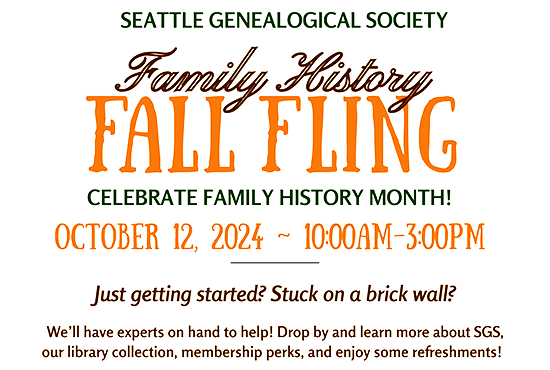 ** 10:00 a.m .- 3:00 p.m. ** Always check the SGS Website Calendar of Events for the meeting links, registration, or for last minute updates or changes to the schedule. Be advised you may need to register in advance to join a meeting. All times listed are Pacific Time unless otherwise noted Wednesday, Oct. 2, 2024, 6:30 p.m.-7:30 p.m., Pacific Northwest Interest Group (Virtual), Share information and discuss Pacific Northwest genealogical research. Register on the SGS website.