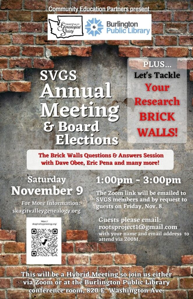 Skagit Valley Genealogical Society Annual Meeting & Brick Wall Questions