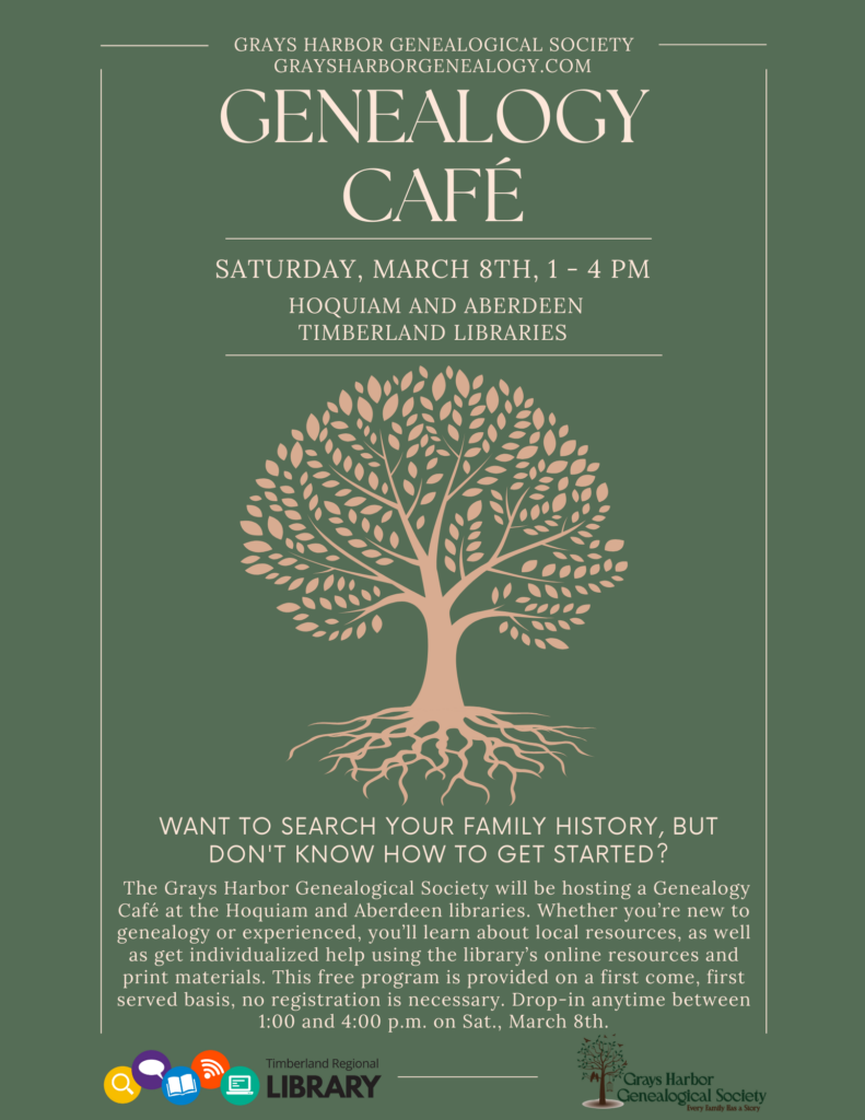 ๐ Dive into your roots and discover the hidden treasures of your family history at the Genealogy Cafรฉ hosted by the Grays Harbor Genealogical Society in partnership with the Timberland Libraries in Hoquiam and Aberdeen. This event is open to all! Don’t miss this exclusive opportunity to connect with experienced genealogists from the Grays Harbor Genealogical Society.