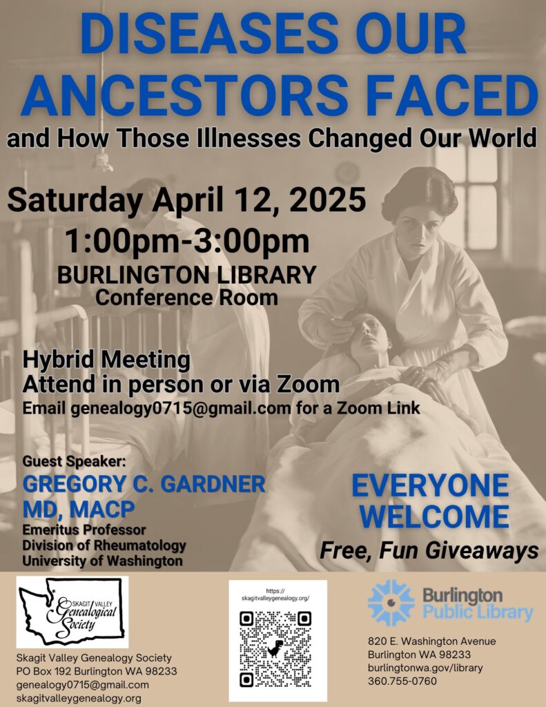 Please join the Skagit Valley Genealogical Society on Saturday, April 12, 2025 at 1pm for the first of our Spring Series, Diseases Our Ancestors Faced and How Those Illnesses Changed Our World with Gregory C. Gardner, MD, MACP. Have you ever come across a death record listing “Brain Fever,” “Consumption,” “Grippe,” and wondered what those illnesses are? In this presentation, Dr. Gardner brings together his medical background with his passion for genealogy. Topics include death records, life expectancy and the major illnesses that changed the course of history. Can’t make it to the Burlington Library, request a zoom link by emailing genealogy0715@gmail.com.