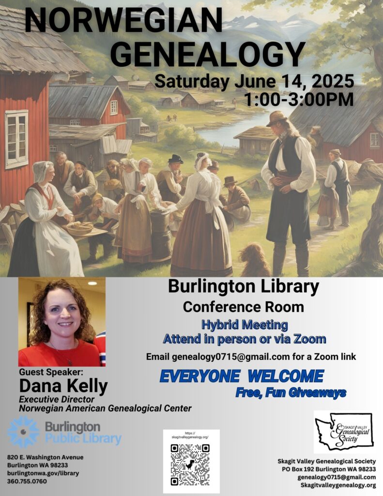 Please join the SVGS on Saturday, June 14, 2025, at 1pm for the last of our Spring Series, Norwegian Genealogy with Dana Kelly, Executive Director of the Norwegian American Genealogical Center (NAGC). NAGC is a non-profit devoted to collecting, preserving and sharing records of Norwegian and Norwegian-American genealogy and immigration history. Can’t make it to the Burlington Library, request a zoom link by emailing genealogy0715@gmail.com.