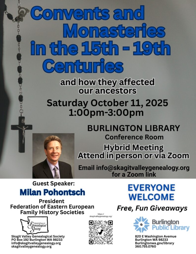 Join Skagit Valley Genealogical Society Saturday, October 11, 2025, 1pm at the Burlington Public Library for “The Role of Convents and Monasteries in the 15th-19th Centuries and How They Affected Our Ancestors”with Milan Pohontsch, President, Federation of Eastern European Family History Societies. Learn about the social and economic impacts of monasteries and how the lives of those that lived and worked on monastic estates differed from peasants under noble rule. Can’t make it to the Burlington Library, request a zoom link by emailing info@skagitvalleygenealogy.org. Thank you,