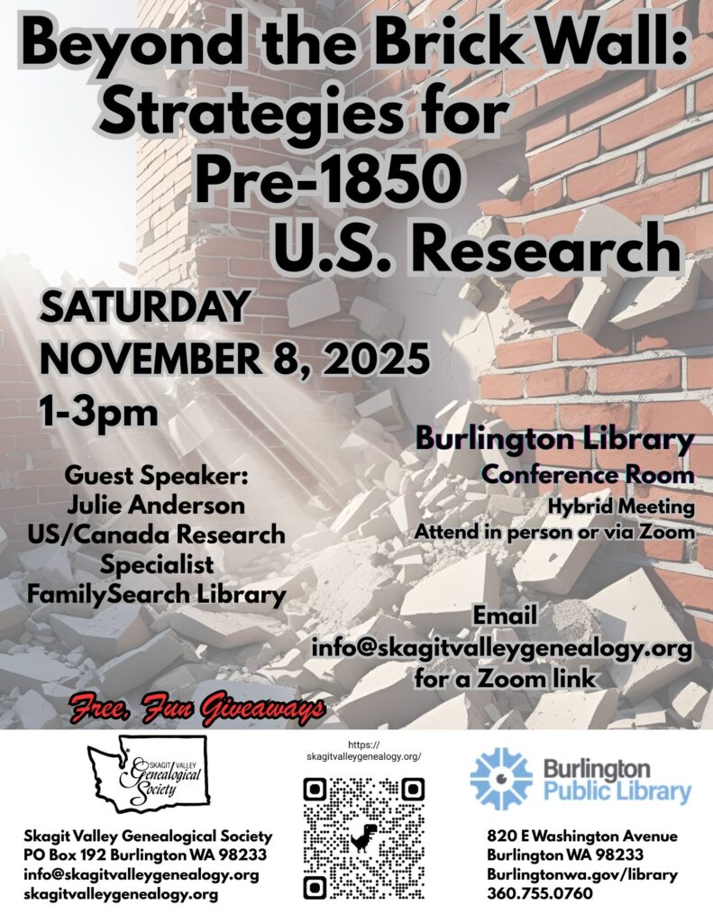 Join SVGS Saturday, November 8, 2025, 1pm at the Burlington Public Library for “Beyond the Brick Wall: Strategies for Pre-1850 U.S. Research” with Julie Anderson. Julie is a U.S./Canada Research Specialist at the FamilySearch Library in Salt Lake City. Come learn what resources and research techniques are available to help you locate your ancestors in records before the 1850 Census. Can’t make it to the Burlington Library, request a zoom link by emailing info@skagitvalleygenealogy.org.
