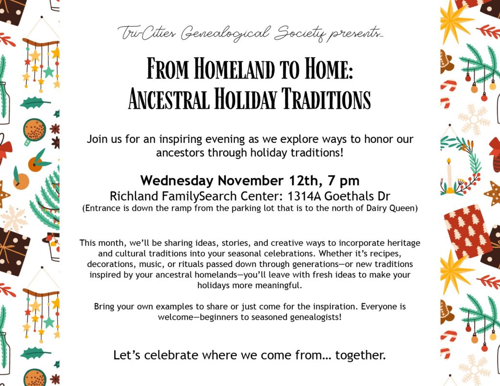 Please join us for Tri-City Genealogical Society’s November General meeting at 7 p.m. on Wednesday, November 12. We will be electing a new board for 2026 and need to have a quorum from the membership. Also, the proposed budget for 2026 will be presented and voted on. After the formalities we will be having an interactive presentation where everyone is encouraged to participate. For people on Zoom the opportunity will be made to share their screen if so desired. See flyer above for details.