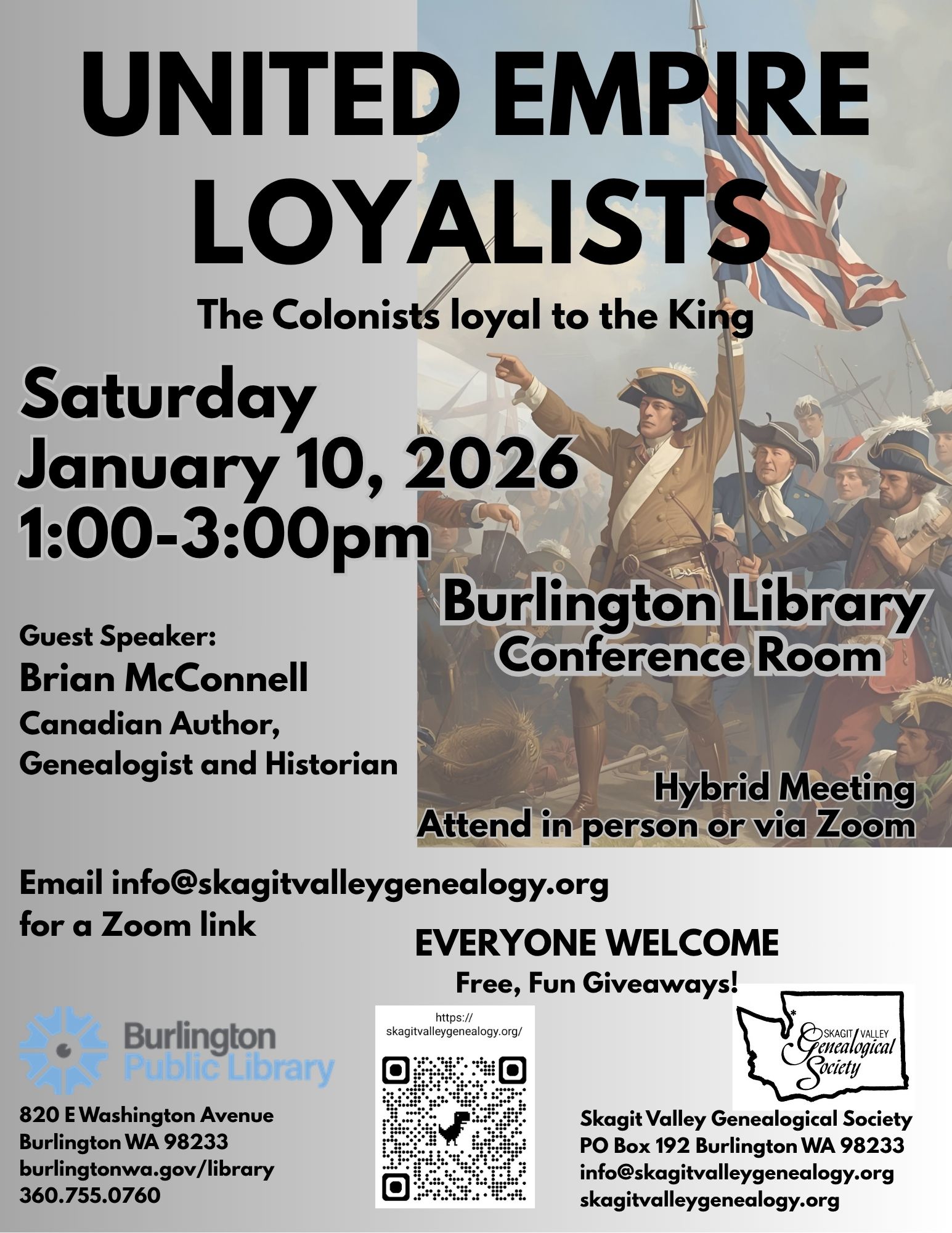 Did a branch of your family suddenly head north to Canada during the Revolutionary War? You just might have just found a United Empire Loyalist ancestor! Join SVGS Saturday, January 10, 2026, at 1pm at the Burlington Public Library for United Empire Loyalists” the Colonists loyal to the King with Brian McConnell. Brian is a Canadian Author, Genealogist and Historian. Come learn about the Colonists that opposed the American Revolution and resettled north of the border in Canada.  Can’t make it to the Burlington Library, request a zoom link by emailing info@skagitvalleygenealogy.org.