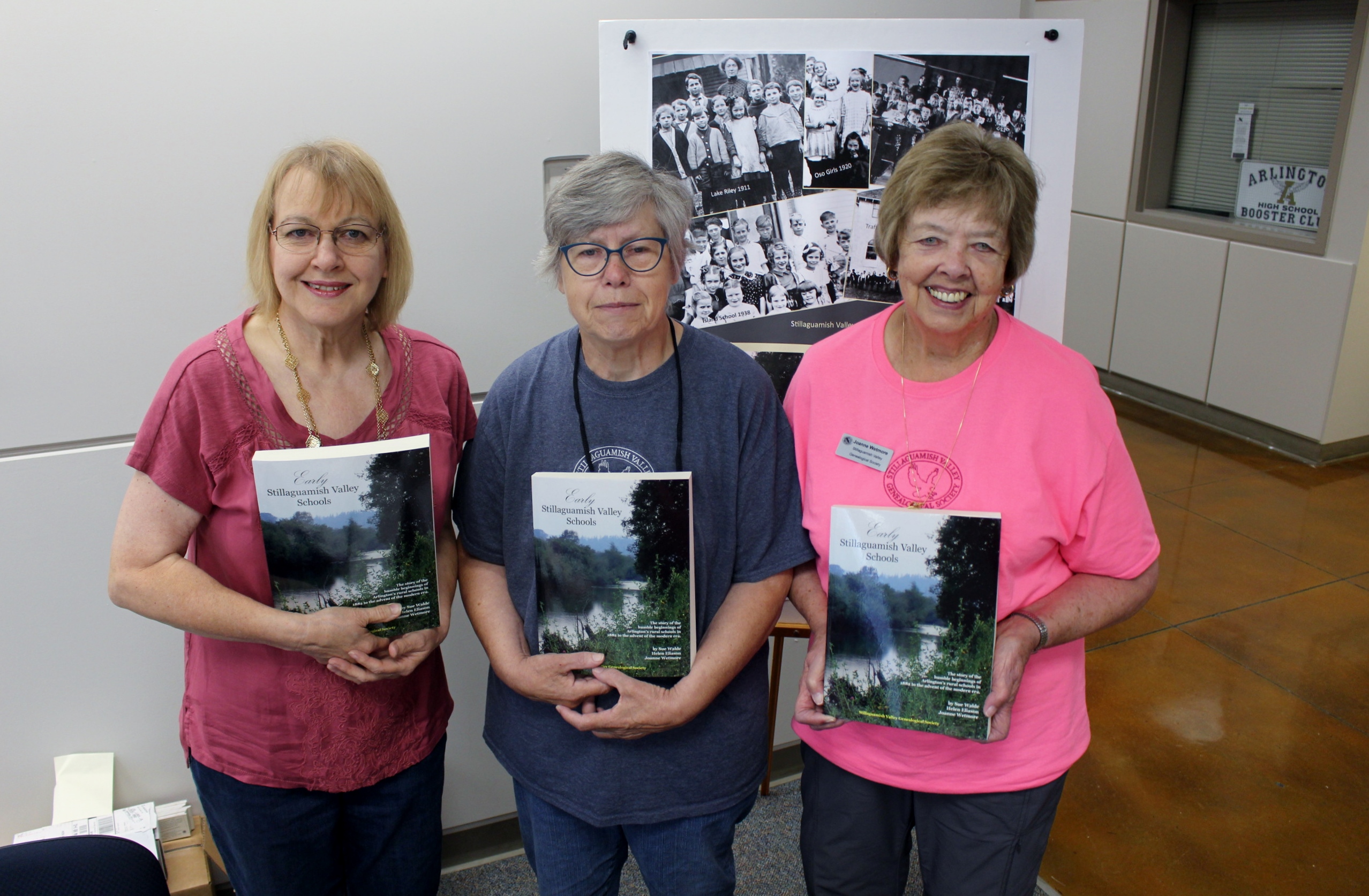 Sue Walde, Helen Eliason and Joanne Wetmore pose proudly with their recently published book, “Early Stillaguamish Schools.” For sale at the conference.