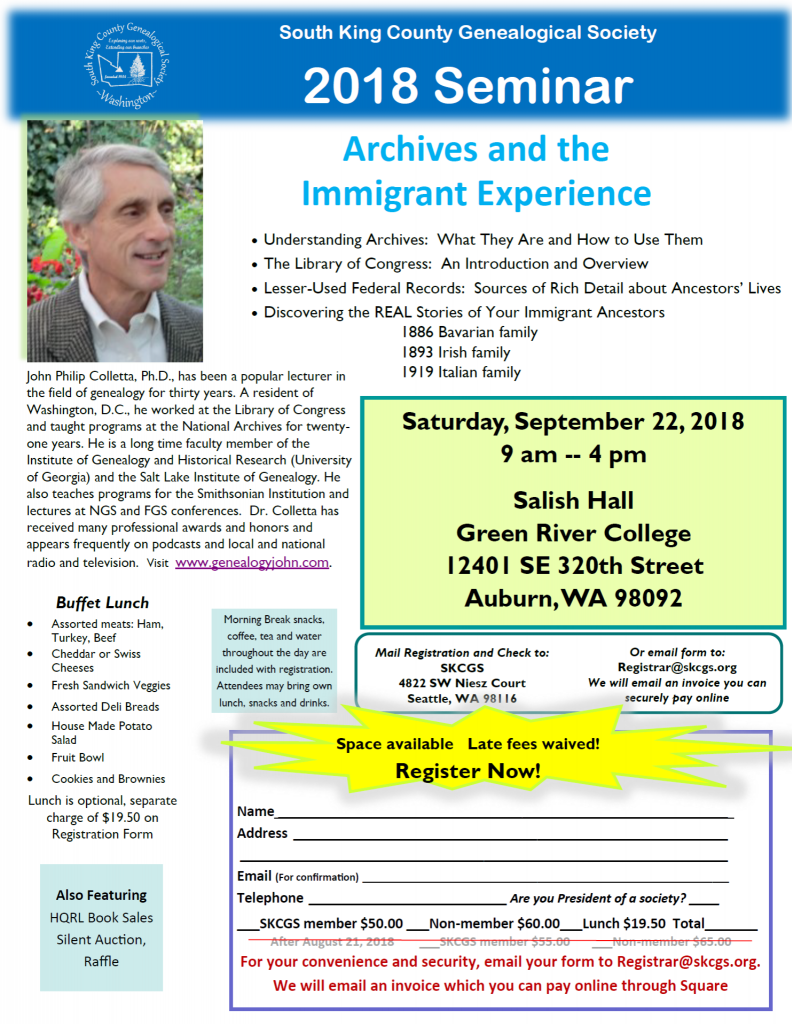If you aren’t one of the 300+ people who have already registered for the conference, don’t despair! You can register at the door for one day, two days or all three! You can’t register online anymore, but show up at the door and the uber-efficient volunteers from conference host Stillaguamish Valley Genealogical Society will get you set up. Just show up early! Doors open at the Byrnes Performing Arts Center at 7:30 a.m.