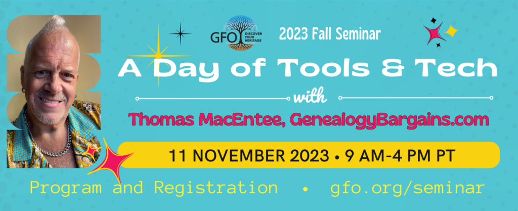 This online seminar is hosted by Genealogical Forum of Oregon and offers a full day of techniques and tips to get the most out researching on the computer. From using common apps in creative ways to squeezing the most out of Google, you are sure to learn something new! The main speaker is the charismatic and always entertaining Thomas MacEntee.