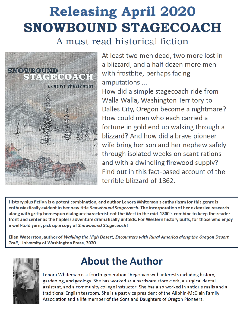 The people involved in this account came from the following families; Stephens, Miller, Allphin, McClain, Scott, Mulkey, Riddle, Davis, Glover, Nichols, McDonald, Niles, Jeffries, Moody, Gay, Jagger, Graham, Irvin, James, Wellington, Bolton, Wilson, Thompson, Hogg, Hunter, Stocking, Johnson and others.”Snowbound Stagecoach” is available from the publisher, Moonglade Press, or from Amazon.