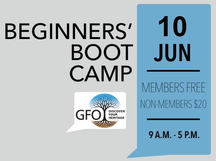 There are 5 seats left for our upcoming Beginners’ Boot Camp on June 10. Just a reminder that Registration closes on June 6 and we won’t be having another Boot Camp until August! This is a great way to get started in your family tree research. GFO members get in free! Join Laurel Smith at the GFO for a day of beginning genealogy.