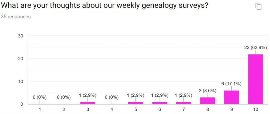 | Additionally, we would like to apologize for using the term “ethnicity” rather than speaking of regions of the world. Ancestry.com also uses “ethnicity” for its test results, while 23andMe uses “origins” and FamilyTreeDNA uses “ancestry composition.” One respondent was kind enough to point out the inaccuracy of “ethnicity” in their response; here is that response, in addition to some others we received: ▪ The word Ethnicity is a social construct and not a scientific one. Too many people mistake the DNA percentages as ethnicity when they are really admixture, bio-geographical or regional comparisons. The public needs to be educated on using the correct terms. I feel it is GFO’s responsibility to do so along with it’s members. After all, what makes one Irish or Swedish…is it because family lived there for 100 or more years? How can you call a person who has half their family white and half black …or even a drop of African heritage…as African American? We need more sensitivity and just state that they have ancestors from various REGIONS of the world. I know two people who are from England and look VERY English, but the Y-chromosome is African. He has no features similar to Africans, so he is considered white. Please do not use the term ethnicity; it’s better to even say cultural groups for your survey. Thank you. ▪ The stories were confirmed by the genealogy research and both were confirmed by the DNA testing. ▪ My ethnicity is Western European: German, French and Scots-English. DNA tests corroborated genealogy research and family stories. ▪ The “ethnicities” in the DNA tests are the most useless part (even if they are what helps sell them), so I don’t count them as anything other than white noise or cocktail party conversation. ▪ DNA can bring some real ethnic surprises. A very small amount of Black showed up in my sisters, second cousins and myself. Also a bit of Jewish and Native American where it comes from is a bit of a mystery. Our mother’s family was from Virginia and had been slave owners. The Jewish possibly came from dad’s Eastern European folks on his mother’s side is my guess. Sis and I are having a good laugh over it because mom was very adamant there was no Indian in her family and that grandpa was “black Irish” he had a dark complexion with black hair. Also how dare anyone think there was any thing but English and Irish in her back ground? We think it’s a real hoot for that reason. So much for family stories. ▪ Discovering the different ethnicities based on DNA has taken my research in a different direction–which has led to some successful discoveries. ▪ Fascinating to see that my ethnicity is more diverse than I’ve found or been told. But then, I don’t have all my ancestors for the last 200 years discovered yet! Do you? Onward … |
