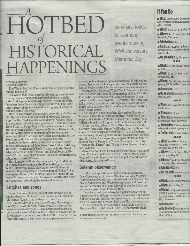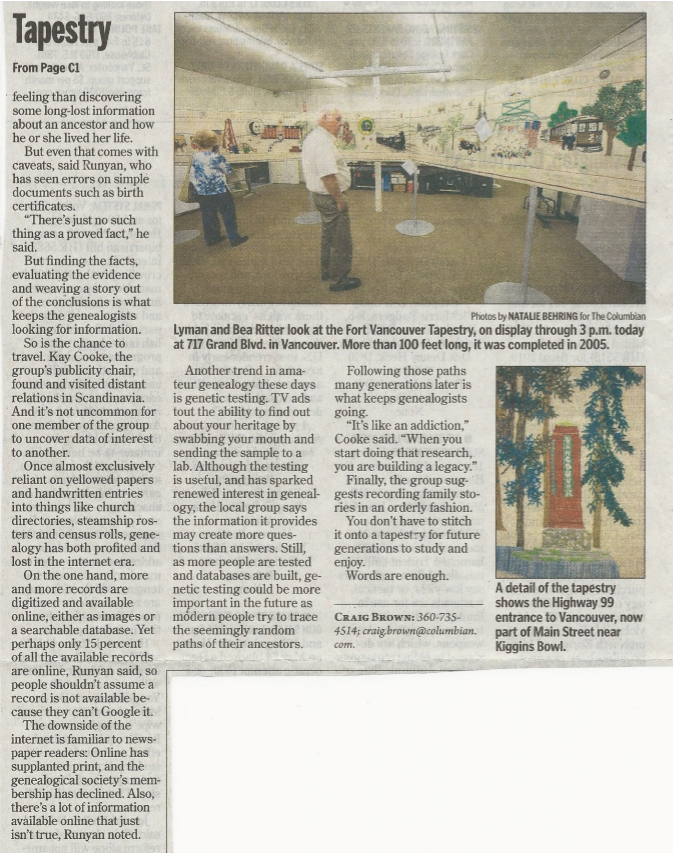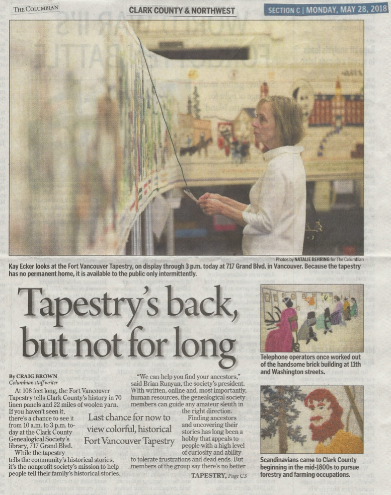 Here are some articles on the Tapestry at the Clark County Genealogical Society annex and another article on the happenings last weekend.
