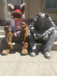 After many years of sitting on the steps of the Museum Annex Building, in 2016, the Wenatchee Area Genealogical Society officially adopted WAGS Coyote as its mascot. No more reading just a candy wrapper – this astute WAGS Coyote became a genealogist. He researched books, maps, and even census records, and inquired of all the people he greeted at the Genealogy Library if they might know about his brother. At last, WAGS Coyote located his brother at the AppleSox ballpark in Wenatchee!