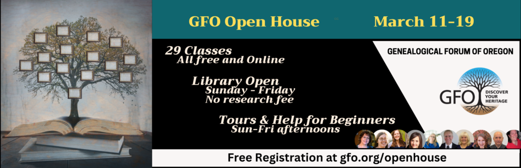 The Genealogical Forum of Oregon is pleased to announce that its 2023 Open House will take place March 11-19.