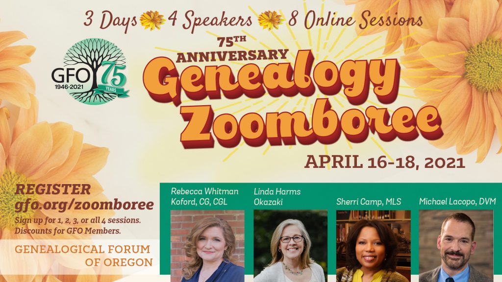 The Genealogical Forum of Oregon celebrates its 75th Anniversary with a multicultural Genealogy Zoomboree, April 16-18.