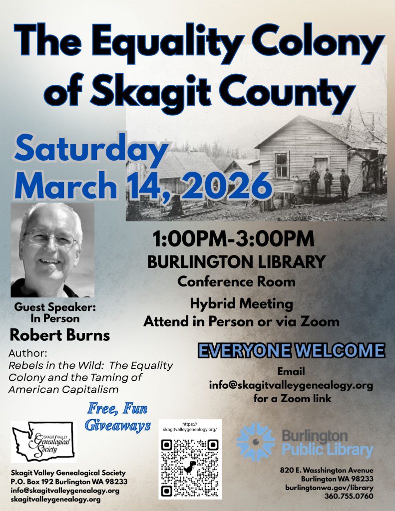 Did your ancestors mysteriously appear in Skagit County in the 1900 Census? Maybe they were in the Equality Colony. Join SVGS on Saturday March 14, 2026, at 1pm at the Burlington Public Library for “The Equality Colony of Skagit County” with Robert Burns, author of “Rebels in the Wild: The Equality Colony and the Taming of American Capitalism”. In the late 1890s a group of like-minded individuals came from around the country to establish a socialist colony in Skagit County. Find out who they were, what motivated them, why they chose Skagit County, and why the colony collapsed. Can’t make it to the Burlington Library, request a zoom link by emailing info@skagitvalleygenealogy.org.