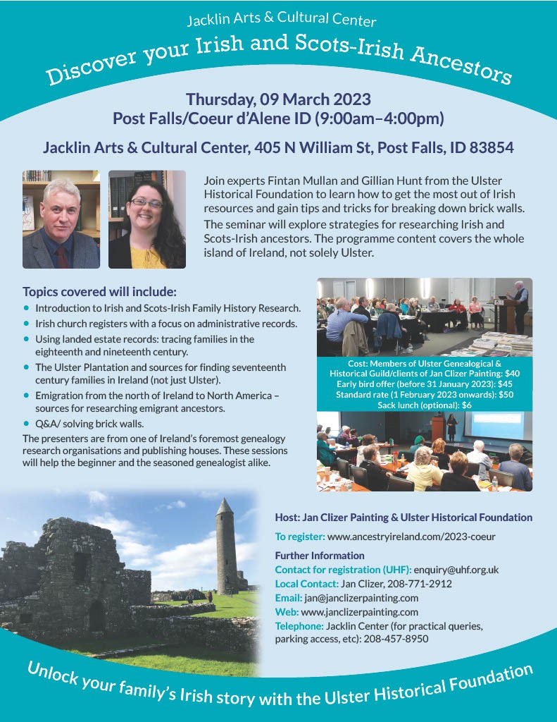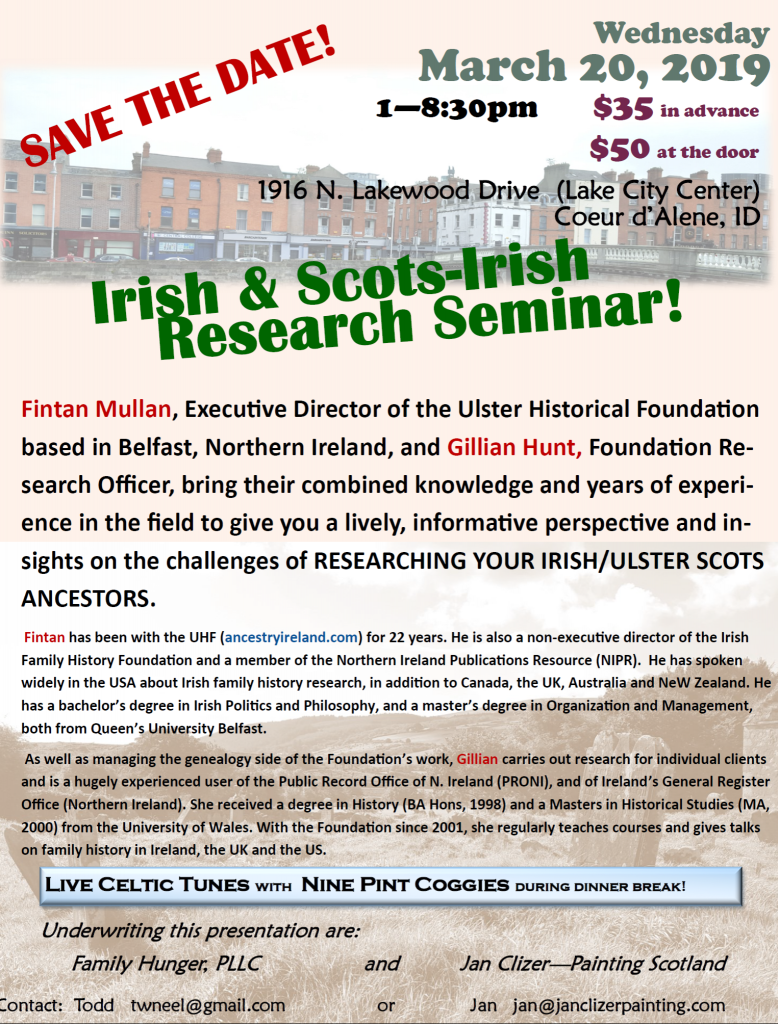 Irish genealogy experts Fintan Mullan and Gillian Hunt from the Ulster Historical Foundation in Belfast are back (virtually!) for the seventh annual Irish Genealogy Workshop.