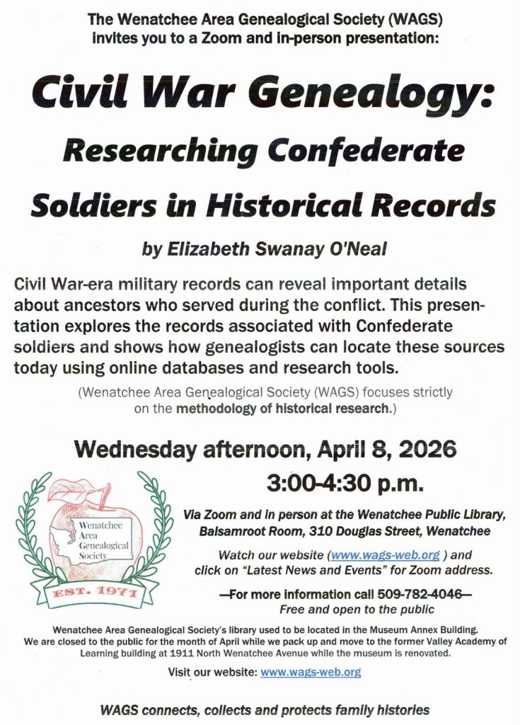 Hazel became interested in genealogy when computers first came into our lives in the early ‘90s. By the early 2000s, she was busy volunteering at the Puget Sound Genealogical Society in Kitsap County. Early in 2020, their loss became WAGS’s gain when she moved to Wenatchee.