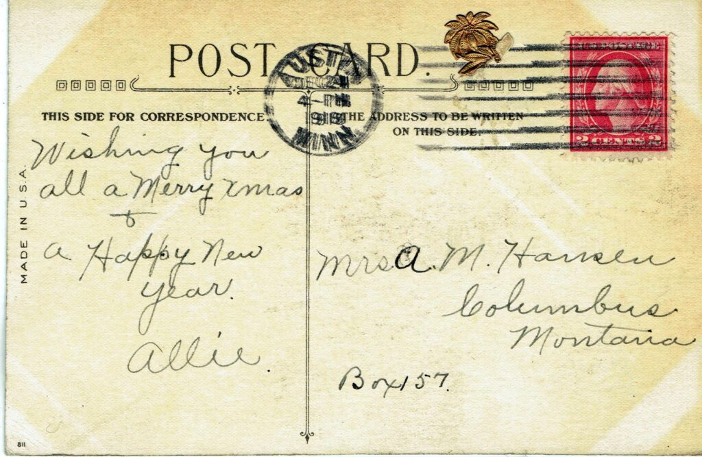 This penny postcard was from Allie Hansen (Alice Hansen, wife of Peter Hansen) to Anna Hansen, wife of Anton Hansen, brother of Peter Hansen. It was postmarked in 1918 and required a 2-cent stamp to help pay for WWI. I guess that is a gold poinsettia stuck on the back.